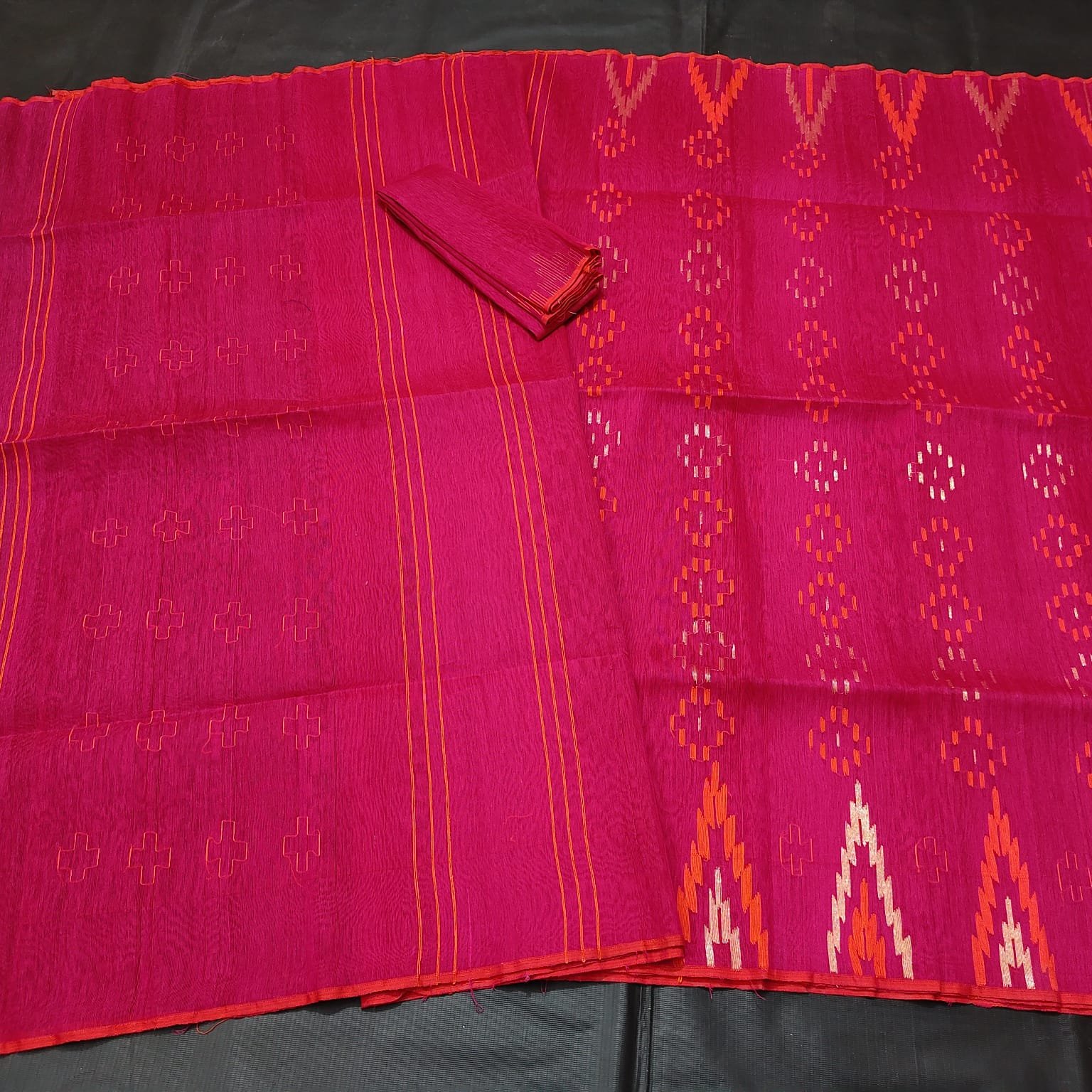 Experience timeless elegance with our Magenta Color Jamdani Saree with Blouse Piece, a stunning blend of tradition and craftsmanship. Woven by skilled Bangladeshi artisans, this saree features intricate handwoven motifs that reflect the rich heritage of Jamdani weaving.