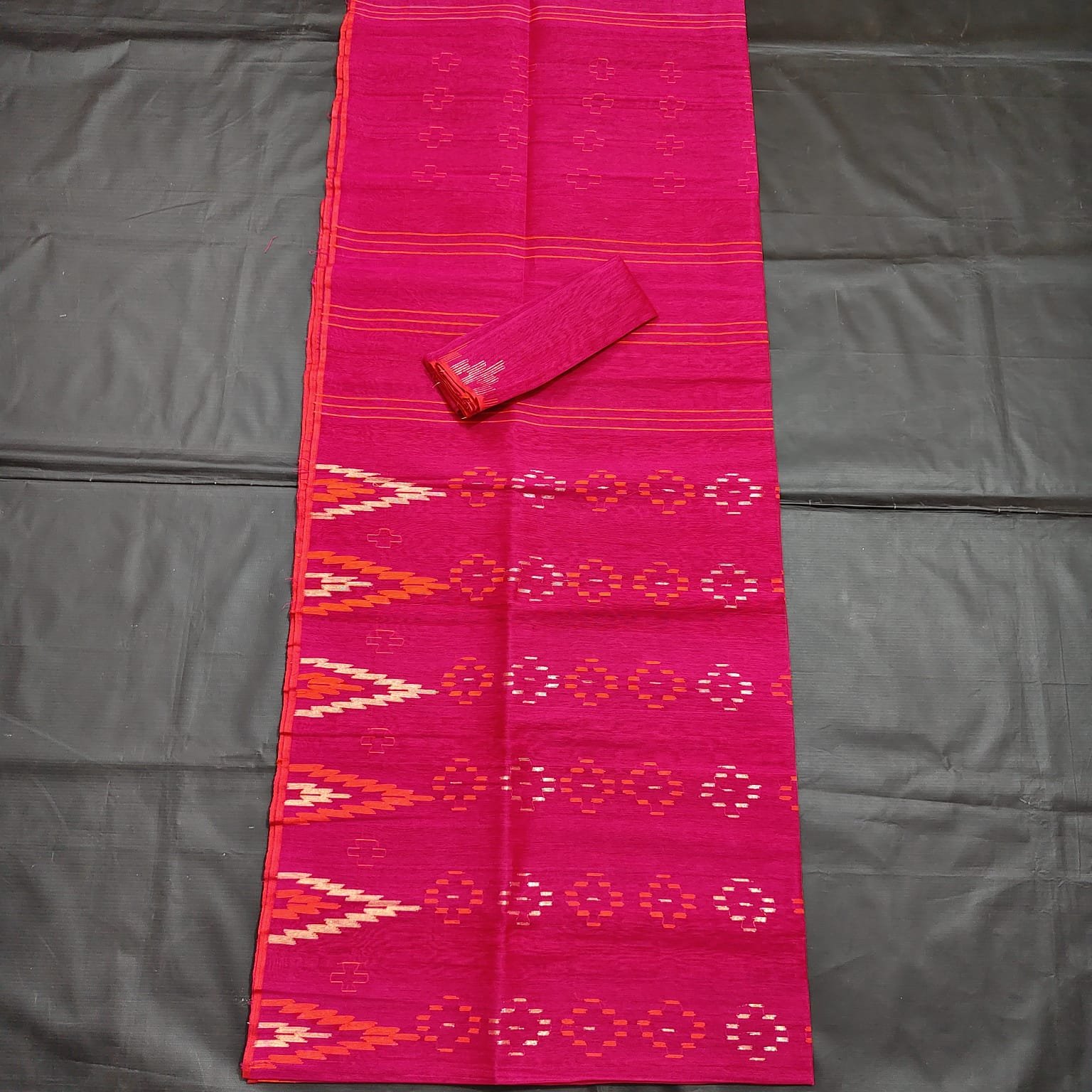 Add a touch of traditional grace to your wardrobe with our Magenta Color Jamdani Saree with Blouse Piece, a beautiful handwoven masterpiece from Bangladesh. Crafted with precision using 40 count cotton yarn, this saree ensures a soft, lightweight, and breathable texture — perfect for both festive occasions and everyday elegance.